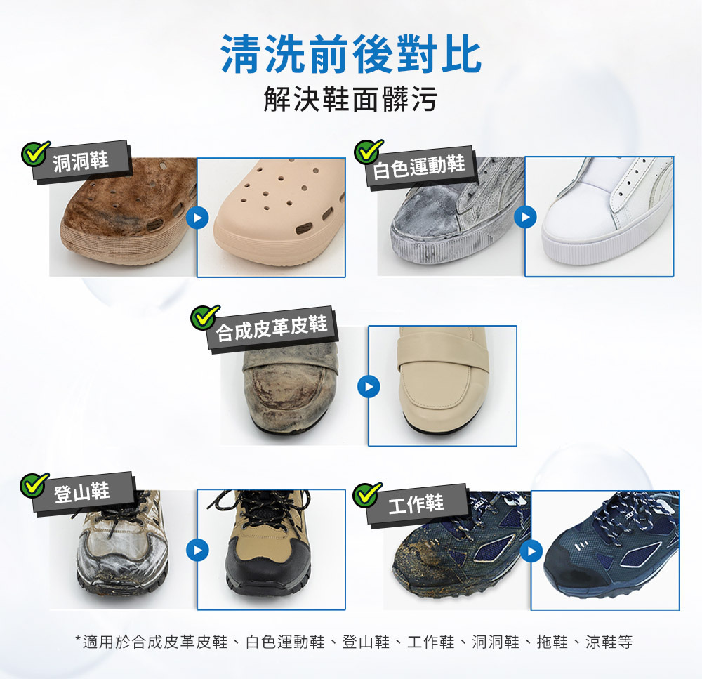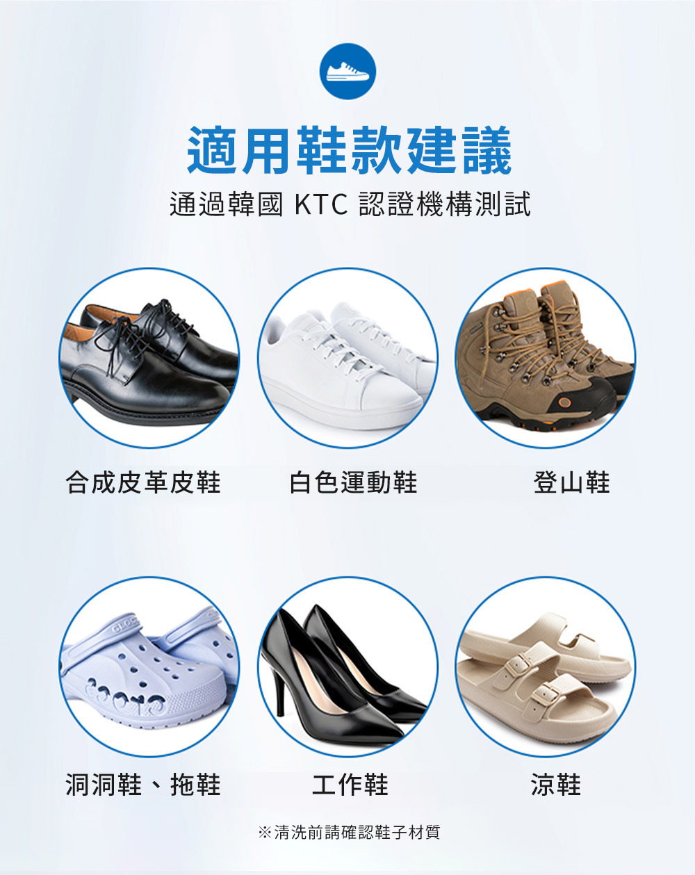適用鞋款建議:合成皮革皮鞋、白色運動鞋、登山鞋、工作鞋、洞洞鞋、拖鞋、涼鞋等