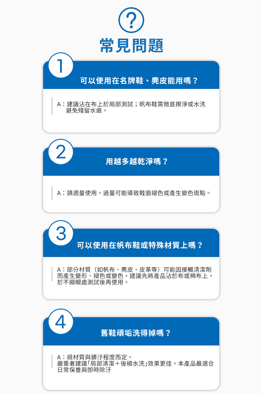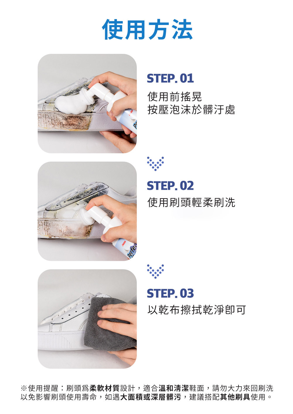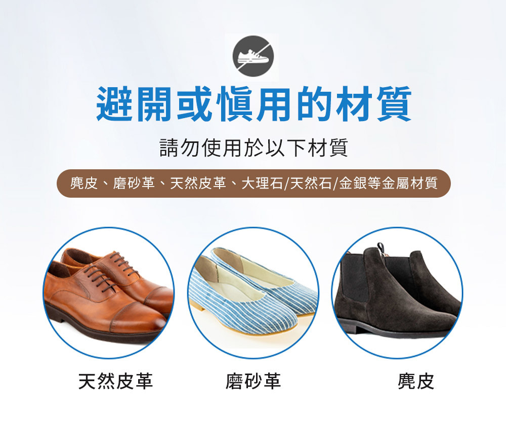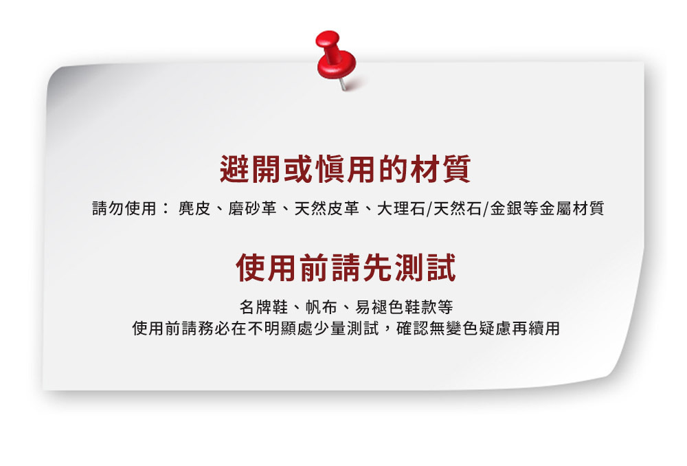 使用前請先測試: 名牌鞋、帆布、易褪色鞋款等,使用前請務必在不明顯處少量測試,確認無變色疑慮再續用