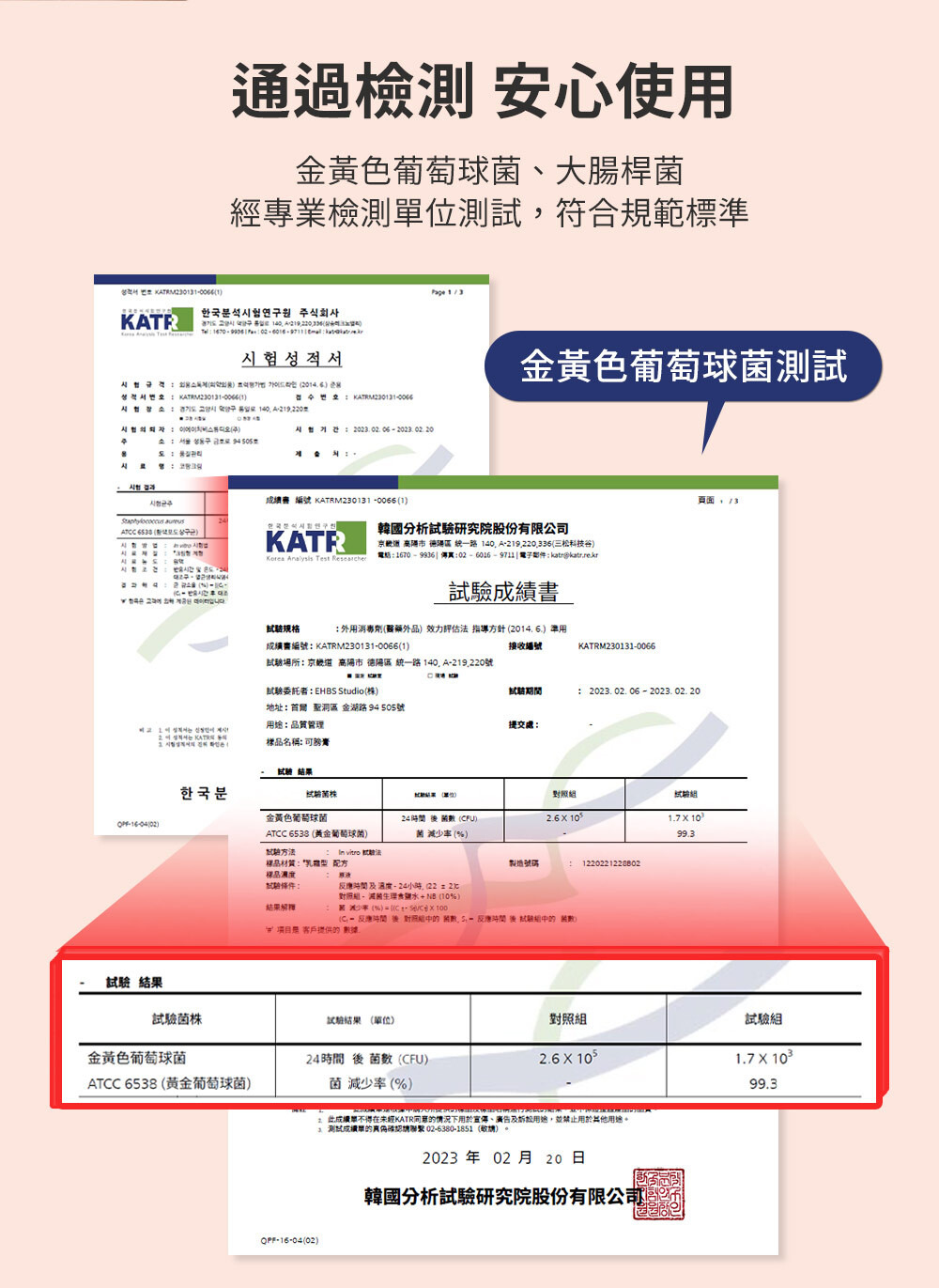⊹ 抗菌測試證明 99.9% 抑菌力