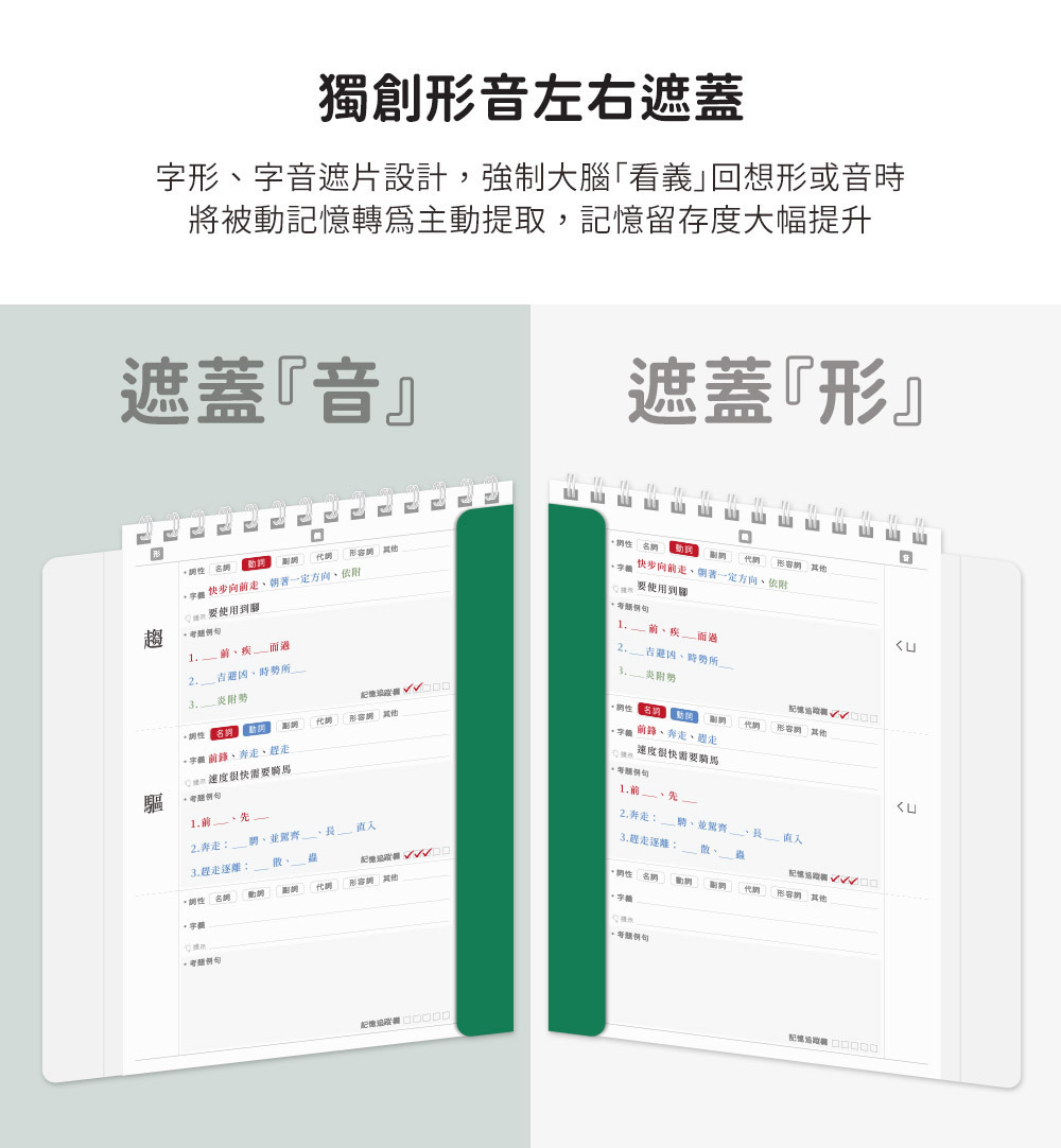 字形、字音遮片設計,強制大腦「看義」回想形或音時,將被動記憶轉為主動提取,記憶留存度大幅提升。