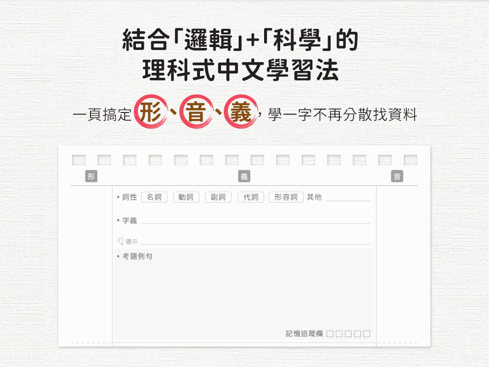 打破條列筆記傳統模式,用「字根」串起整組「字形相似字」 (如:涇/逕/脛),提升辨識與推論能力,像解數學題一樣有邏輯。