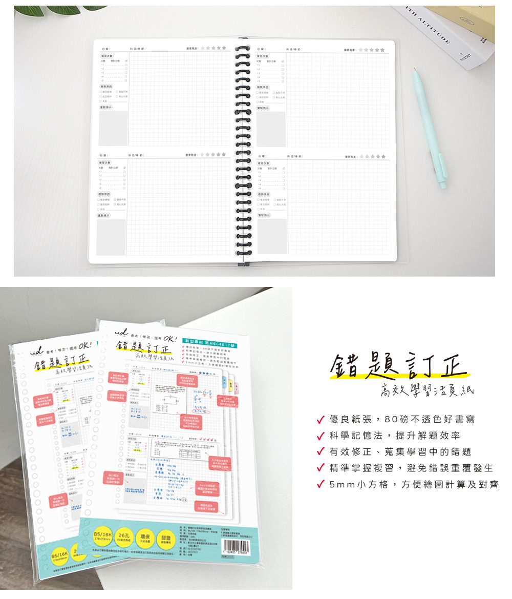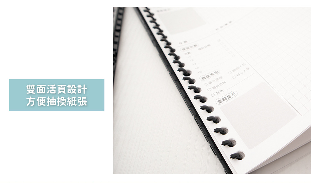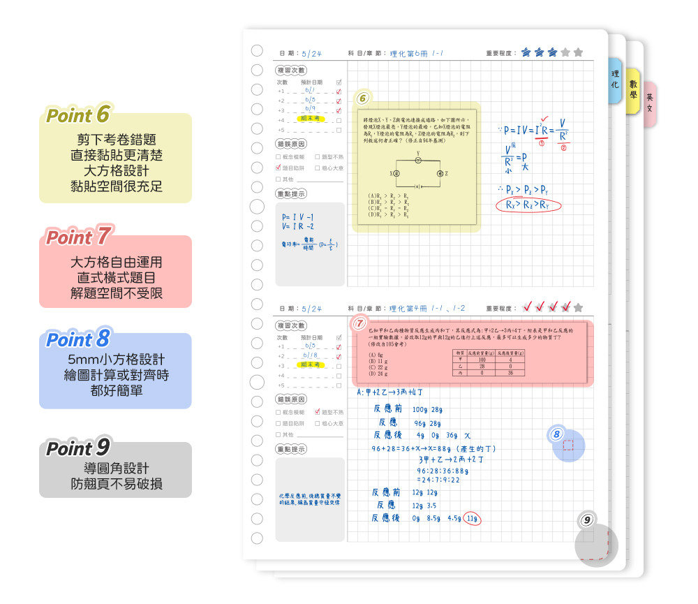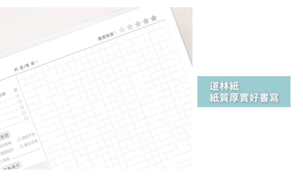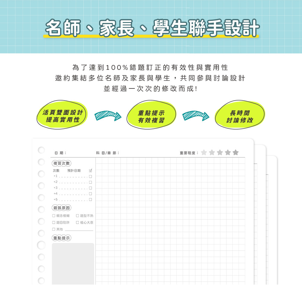 經過反覆修改設計而成,更貼近學生需求,比市售筆記紙張更好用 !