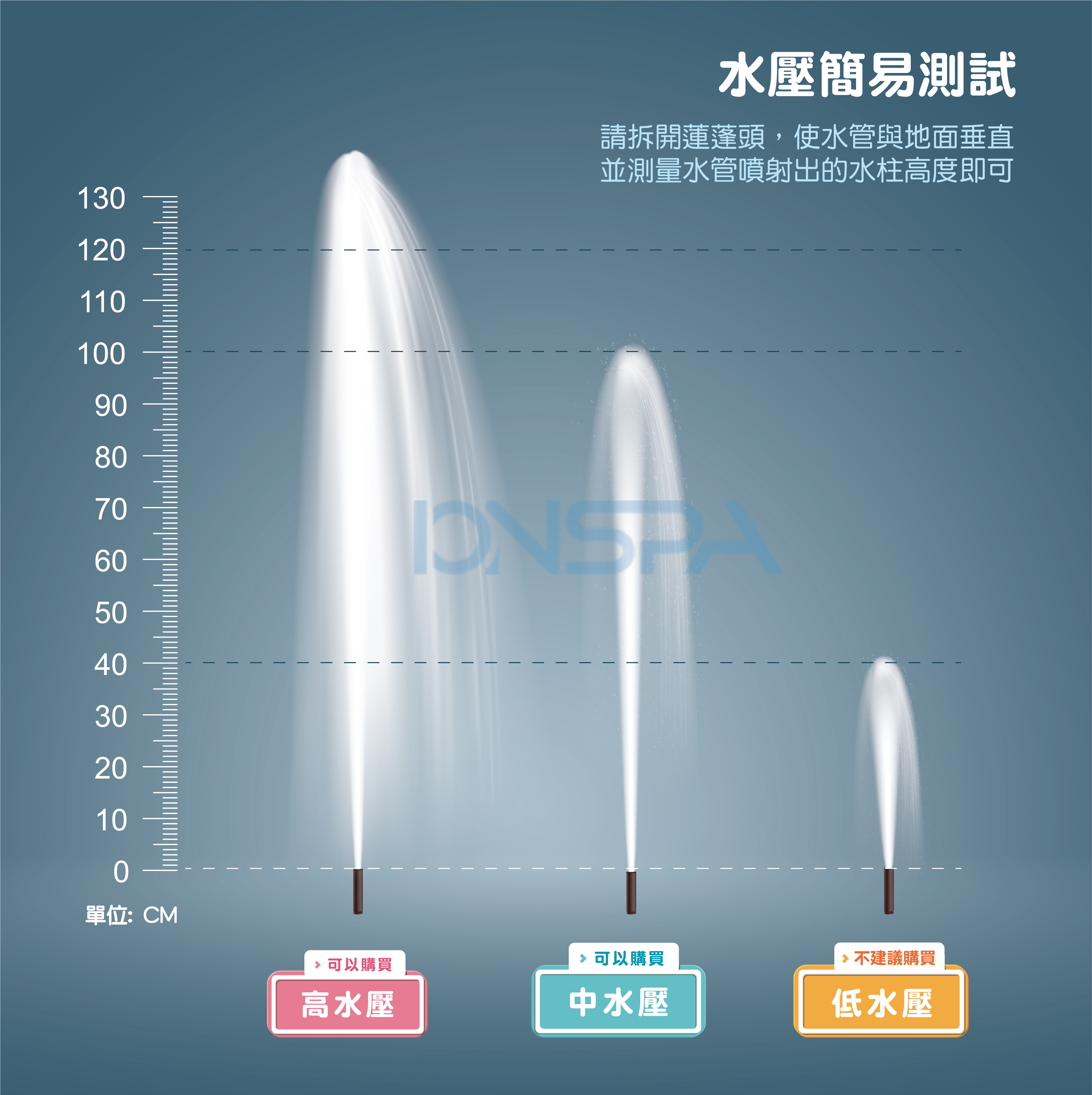 注意事項 | 購買前建議先拆開家中蓮蓬頭,並依照下圖所示確認家中水壓狀況,若因水壓問題導致無法使用,恕無法退換貨。