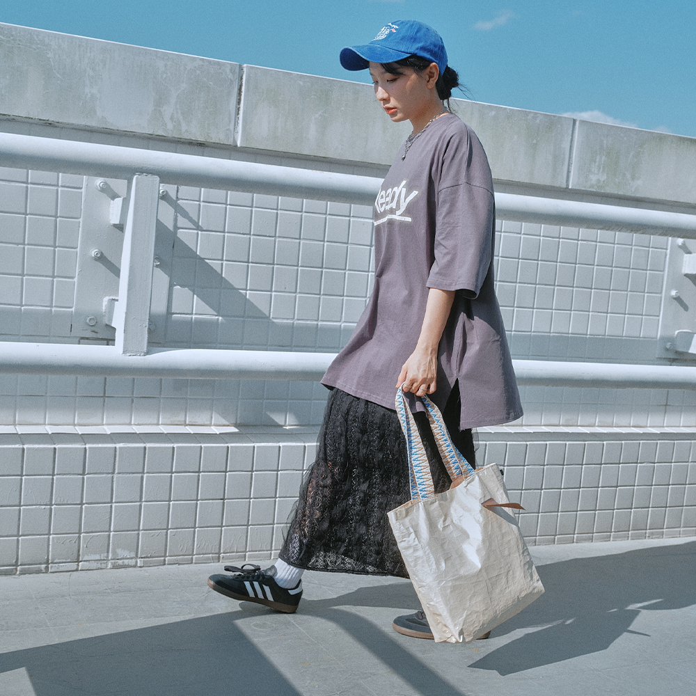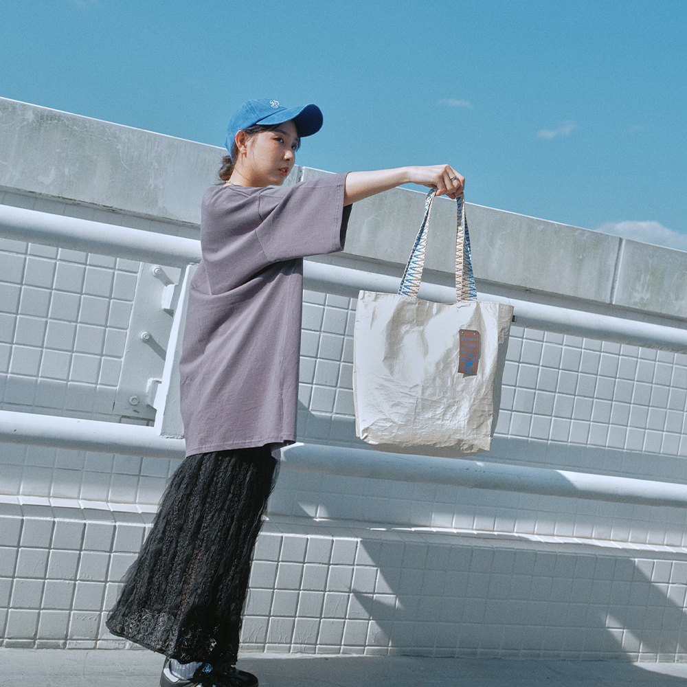 提袋上縫製跳色大布標,是品牌的招牌特色