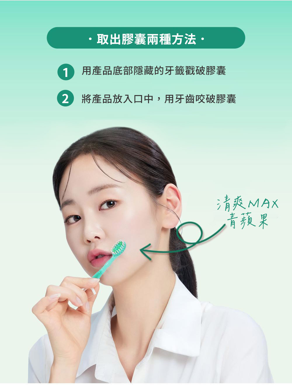 刷牙即可自然刷破膠囊 (亦可使用牙線尖端處刺破膠囊)